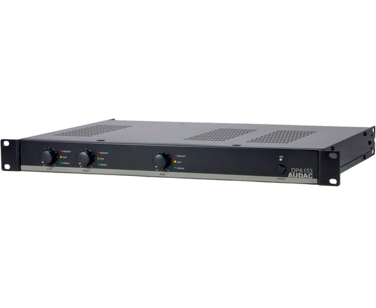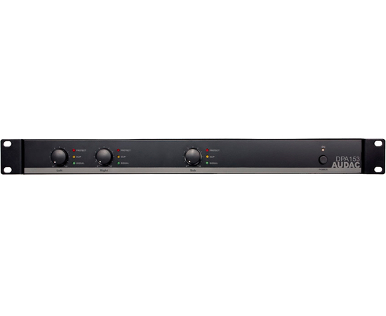 Трехканальный усилитель класса D AUDAC DPA153 обладает номинальной мощностью 150 Вт на канал (4 Ом). В мостовом режиме развиваемая мощность на нагрузке 8 Ом составляет 300 Вт. Помимо этого, у модели предусмотрен дополнительный канал усиления мощностью 300 Вт RMS, предназначенный для подключения пассивного сабвуфера. В блоке предварительного усилителя сабвуферного канала имеется активный фильтр низких частот с фиксированной частотой среза 120 Гц. Источник питания - импульсный.