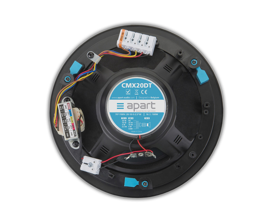 При использовании громкоговорителя на 16 Ом можно подключить до 4 громкоговорителей параллельно на каждый канал стандартного усилителя на 4 Ом. Для использования с напряжением 70 или 100 вольт CMX20DT оснащен разъемом Quick Fit, удобным входным и выходным разъемом через нажимную клемму для подключения проводов громкоговорителей до 2,5 мм.
