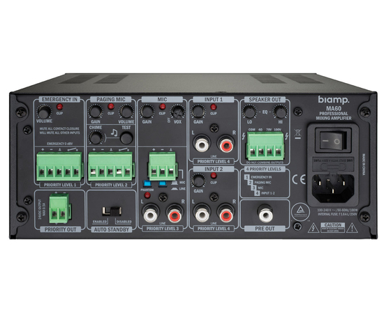 MA60 имеет четыре уровня приоритета для маршрутизации звука: один аварийный вход, один пейджинговый вход, микрофонный/линейный вход и два линейных стереофонических входа с суммированием в моно. Качество звука, простота использования и универсальный набор функций делают MA60 идеальным решением для различных профессиональных аудиоприложений.