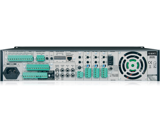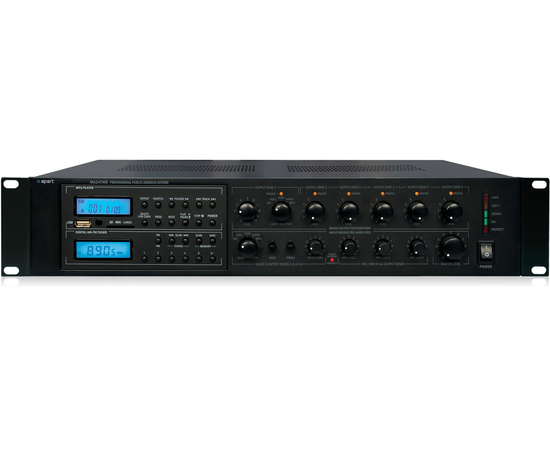 APart MA247MR - 6 зонный микшер-усилитель/предусилитель со встроенным тюнером и MP3/USB/SD плеером, с регуляторами громкости для каждой зоны (зона 1 имеет только линейный выход) и функцией подключения внешнего усилителя. Усилитель имеет 4 микрофонных балансных входа с возможностью регулировки чувствительности и тембров для каждого, а также до 4 входов линейного уровня и аварийный вход. APart MA247MR имеет 6 уровней приоритета.