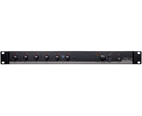 AUDAC PRE116 – простой в использовании, но функционально мощный 6-канальный стереофонический предусилитель высотой 1U, монтируемый в 19'' стойку. В дополнение к стандартным входам, оснащен приемником Bluetooth (канал 3) и дополнительным входом стереоаудио miniJack 3,5 мм (канал 4). Устройство имеет переключатель выходного сигнала моно/стерео и возможность удаленного мьютирования. Подходит для широкого диапазона различных приложений.