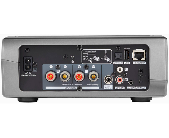В дополнение к стерео-выходам усилителя, на борту также имеются выход на сабвуфер, линейный вход для подключения аналоговых (с помощью RCA кабеля) источников, оптический вход и вспомогательный (AUX) с 3.5 мм разъёмом вход для прямого подключения к разъёму для наушников портативного устройства.