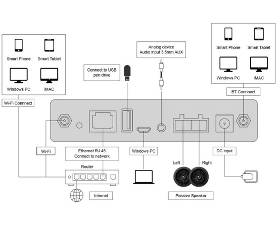 DSPPA DW0235 позволит вам транслировать музыку с ваших "умных" устройств, USB, NAS или потоковых сервисов, таких как Spotify, Tidal или Qobuz, в высоком разрешении с помощью приложения 4STREAM, AirPlay, Bluetooth или других совместимых приложений сторонних производителей.