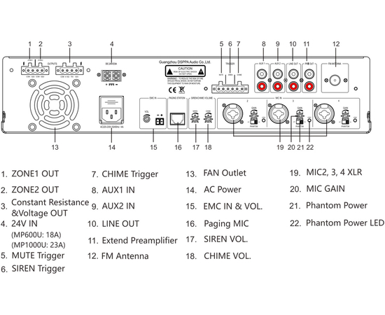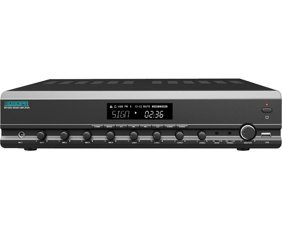 DSPPA MP1000U — это 350-ваттный 2-зонный микширующий усилитель, интегрированный с функциями USB-флэш-проигрывателя, FM, Bluetooth и удаленного пейджинга. Он имеет различные функции, в том числе отображение статуса на экране, вход EMC, микрофонные входы с фантомным питанием, приоритет входов, удобство и простоту использования. Устройство может удовлетворить обширные требования пользователей и может иметь широкое применение.