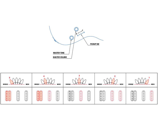 Ручка громкости, ручка регулировки тембра, 5 позиционный переключатель звукоснимателей