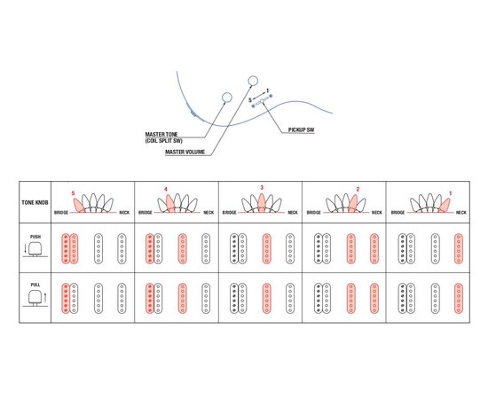 Ручка громкости, ручка регулировки тембра (с функцией отсечки катушек хамбакера), 5 позиционный переключатель звукоснимателей