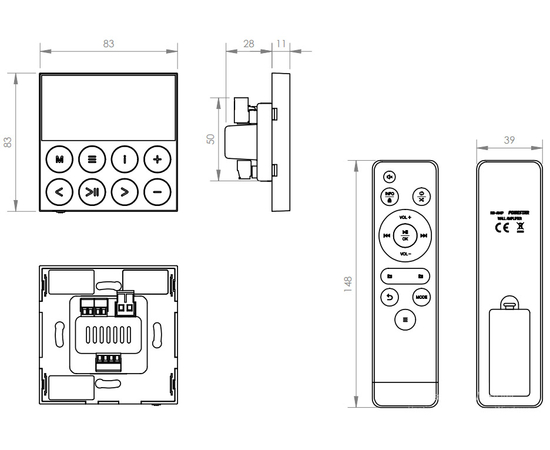 Размеры усилителя: Внешние размеры: 83 x 83 x глубина 42 мм, Расстояние между винтами: 60 мм