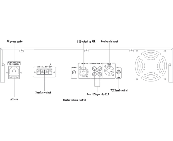 - Выход на громкоговорители: 70 В, 100 В и 4-16 Ом