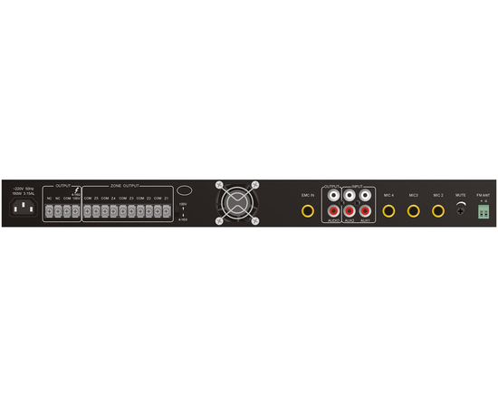 - 1 аварийный вход EMC (небалансный Jack 6,3 мм), 2 линейных входа для подключения внешних источников музыки AUX (2 х RCA), 4 микрофонных входа MIC (Jack 6,3 мм), линейный выход (2 х RCA)