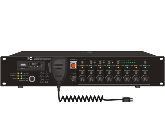 Комбинированная система оповещения ITC Audio VA-6200MA представляет собой моноблок для построения полнофункциональных систем оповещения и управления эвакуацией (СОУЭ). Система включает в себя блок автоматического контроля до 8 линий громкоговорителей, трансляционный усилитель мощностью 500 Вт с 6 аудиовходами, темброблоком, поканальными регуляторами громкости регуляторами и селектором зон. Помимо этого, в систему встроен аудио проигрыватель с поддержкой внешних USB/SD накопителей, которые расширяют мультимедийные возможности системы.