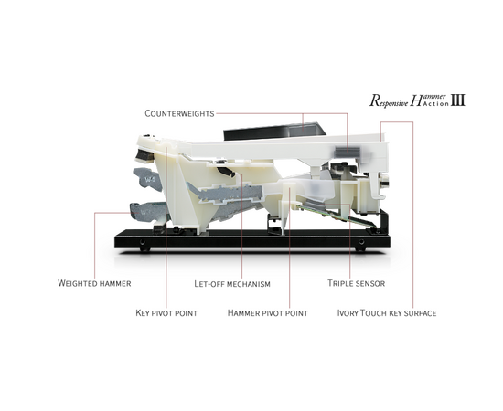 Новая механика Responsive Hammer III (RHIII) воссоздает характерные ощущения от нажатия клавиш, как у настоящего акустического рояля. Очень естественный ход клавиатуры и технология с использованием трех сенсоров высокой точности обеспечивает прекрасную отзывчивость инструмента для динамичного и реалистичного исполнения. Градиент тяжести клавиатуры отражает распределение веса молоточков акустического фортепиано: клавиши нижних октав требуют большего усилия при нажатии, а клавиши верхних – меньшего, в то время как конструктивное усиление механики повышает стабильность при исполнении фортиссимо и стаккато.