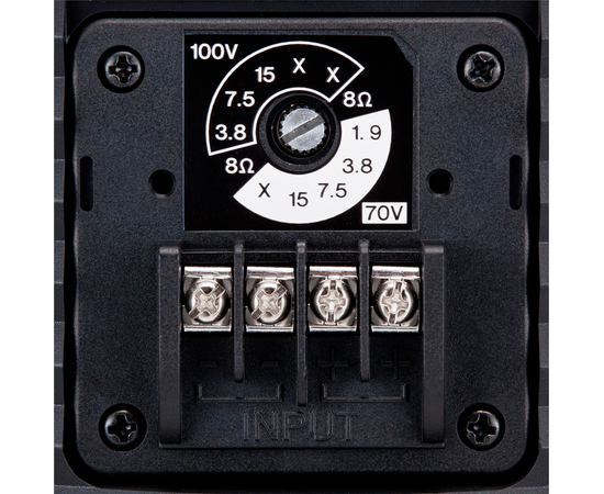 С помощью переключателя, расположенного на задней панели, можно выбирать напряжение 70 или 100 В для распределенной системы трансляции или в режиме 8Ом . Для изменения настройки переключатель следует повернуть при помощи отвертки. Терминалы подключения проводов и переключатель можно закрыть входящей в комплект крышкой.