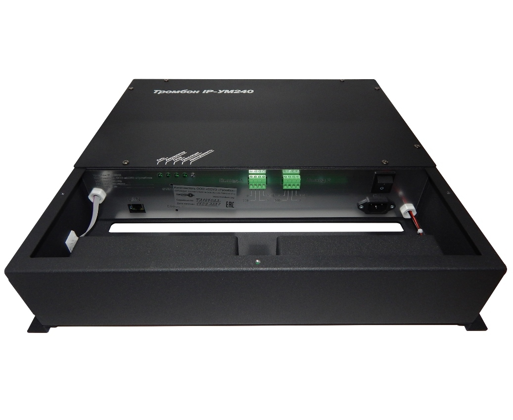 Усилитель мощности Тромбон IP-УМ240 работает в составе системы звукового вещания, оповещения и управления эвакуацией «Тромбон IP». Предназначен для приёма голосовых, звуковых, тревожных и иных сообщений от пультов звукового вещания, модулей оповещения и прочих устройств управления; приёма цифрового звукового контента, декодирования и воспроизведения на оконечные устройства – речевые оповещатели. Усилитель осуществляет контроль линий связи в случае использования в составе систем СОУЭ и/или прочих систем, требующих обязательного контроля.