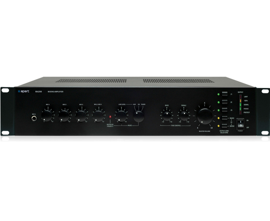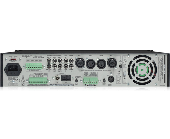 APart MA200 - профессиональный 4-х зонный трансляционный микшер-усилитель мощностью 200 Вт. Все микрофонные входы имеют встроенный голосовой фильтр, благодаря использованию уникальной схемотехники, имеют низкий уровень шумов и позволяют использовать микрофонные линии большой протяженности. APart MA200 имеет 3 микрофонных, 1 микрофонный/линейный, 3 селективных линейных и 1 аварийный вход. Поставляется в настольном варианте. Металлический адаптер для монтажа в стандартную 19" рэковую стойку в комплекте. Включение фантомного питания микрофонных линий осуществляется при помощи перемычки внутри корпуса. Усилитель может питаться от сети переменного тока ~230 В или источника постоянного тока 24 В.