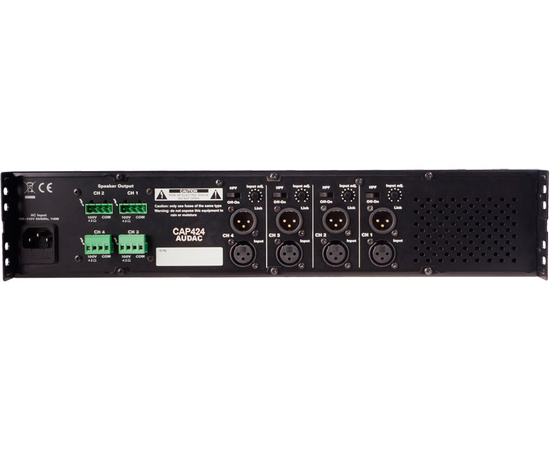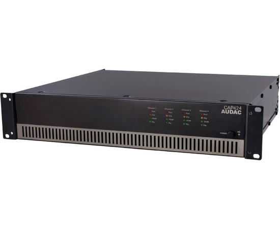 Усилитель Audac CAP424 для трансляционных систем напряжением 100 В. Усилитель класса D, сочетает в себе конструктивную надежность, высокую эффективность и простоту эксплуатации. Номинальная мощность - 240 Вт RMS на канал. Балансные входы реализованы на разъемах XLR (female); предусмотрены сквозные балансные выходы (XLR male). Универсальный блок выходов на акустические системы сделан на базе клеммных колодок 2 типов, предназначенных для подключения громкоговорителей с линейными трансформаторами 100 В (42 Ом). Усилитель оборудован схемами защиты от перегрузки, перегрева, короткого замыкания и постоянной составляющей. Охлаждение - принудительное. Кроме того, у модели имеются регуляторы чувствительности входов и тумблеры отключения фильтров высоких частот в каждом канале. Материал корпуса - сталь. Цвет - черный, с фронтальной накладкой серебристого цвета. Усилитель занимает высоту 2U в стандартной стойке 19".