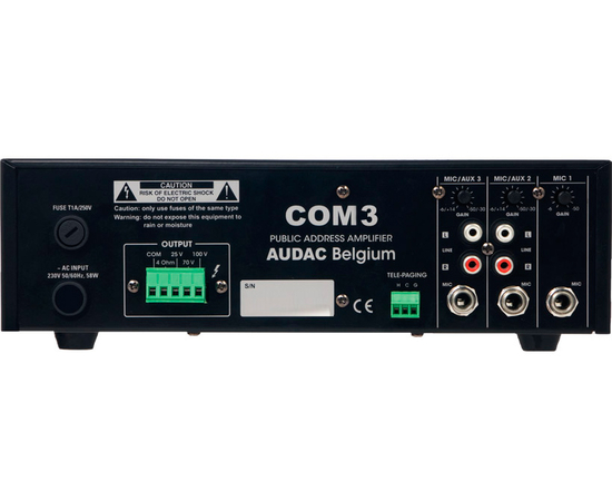 AUDAC COM3 - усилитель-микшер для систем озвучивания и оповещения с выходной мощностью до 30 Вт. Оснащен 2-мя несимметричными линейными стереовходами, которые могут переключаться по уровню с линейного на микрофонный, и одним микрофонным входом. Таким образом, максимально может быть подключено 3 симметричных (балансных) микрофона. Уровень выходной мощности можно регулировать посредством подключения на высокоомные выходы с напряжением 100, 70 или 25 В или на выход с нагрузкой 4 Ом. Усилитель оснащен системой защиты от сбоев в работе: скачков напряжения, коротких замыканий, перегрева и перегрузки. Органы управления, такие как регулировка громкости каждого канала, двухполосный регулятор тембра, регулировка общей громкости и светодиодные индикаторы наличия сигнала расположены на передней панели усилителя.