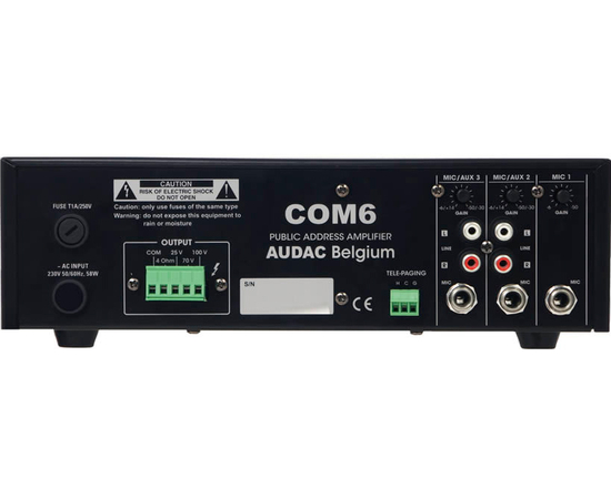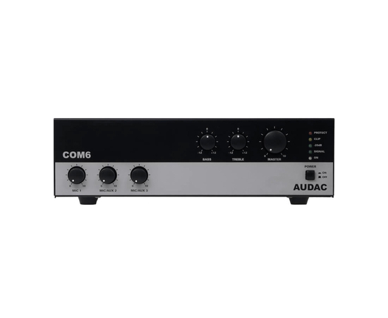 AUDAC COM6 - усилитель-микшер для систем озвучивания и оповещения с выходной мощностью до 60 Вт. Оснащен 2-мя несимметричными линейными стереовходами, которые могут переключаться по уровню с линейного на микрофонный, и одним микрофонным входом. Таким образом, максимально может быть подключено 3 симметричных (балансных) микрофона. Уровень выходной мощности можно регулировать посредством подключения на высокоомные выходы с напряжением 100, 70 или 25 В или на выход с нагрузкой 4 Ом.