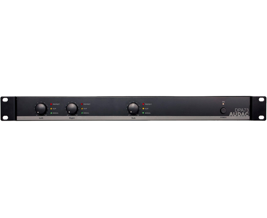 Трехканальный усилитель класса D AUDAC DPA73 обладает номинальной мощностью 75 Вт на канал (4 Ом). В мостовом режиме развиваемая мощность на нагрузке 8 Ом составляет 150 Вт. Помимо этого, у модели предусмотрен дополнительный канал усиления мощностью 150 Вт RMS, предназначенный для подключения пассивного сабвуфера. В блоке предварительного усилителя сабвуферного канала имеется активный фильтр низких частот с фиксированной частотой среза 120 Гц. Источник питания - импульсный.