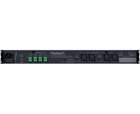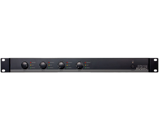 AUDAC EPA104 – четырехканальный усилитель мощности класса D. Выходная мощность 4х100 Вт/4 Ом, 4х50 Вт/8 Ом, 2х200 Вт/8 Ом. Переход в режим ожидания при отсутствии сигнала. Защита от короткого замыкания, перегрева, перегрузки, ограничение выходного сигнала. Режимы работы: мостовой/стерео/параллельный, возможно включение кроссовера 120 Гц. Входы: 4х XLR (розетка). Стальной корпус высотой 1U в рэковом исполнении.