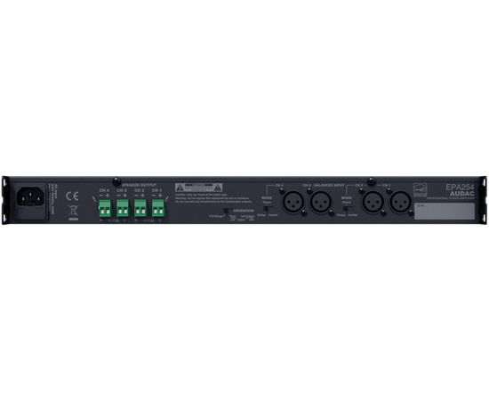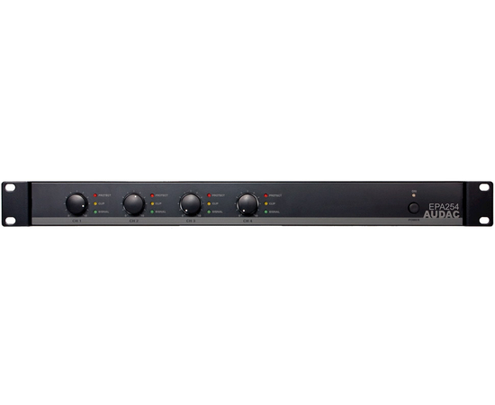 AUDAC EPA254 – четырехканальный усилитель мощности класса D. Выходная мощность 4х250 Вт/4 Ом, 4х130 Вт/8 Ом, 2х500 Вт/8 Ом. Переход в режим ожидания при отсутствии сигнала. Защита от короткого замыкания, перегрева, перегрузки, ограничение выходного сигнала. Режимы работы: мостовой/стерео/параллельный, возможно включение кроссовера 120 Гц. Входы: 4 х XLR (розетка). Стальной корпус высотой 1U в рэковом исполнении.