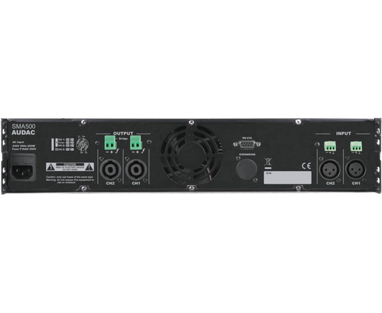Секция усилителя мощности построена на базе модулей класса D мощностью 500 Вт RMS на канал (4 Ом) в стерео режиме или 1000 Вт RMS в мостовом подключении. Усилитель снабжен вентиляторным охлаждением и эффективными схемами защиты от перегрузки, короткого замыкания и перегрева. Входные терминалы реализованы на XLR (3 pin female) и клеммных колодках (3 pin 3,81 мм). Профессиональные выходные разъемы Speakon дублируется также клеммными колодками (2 pin 5,08 мм). Корпуса моделей серии SMA имеют стандартную ширину 19'' и высоту 2U. Материал корпуса – сталь. Цвет - черный.